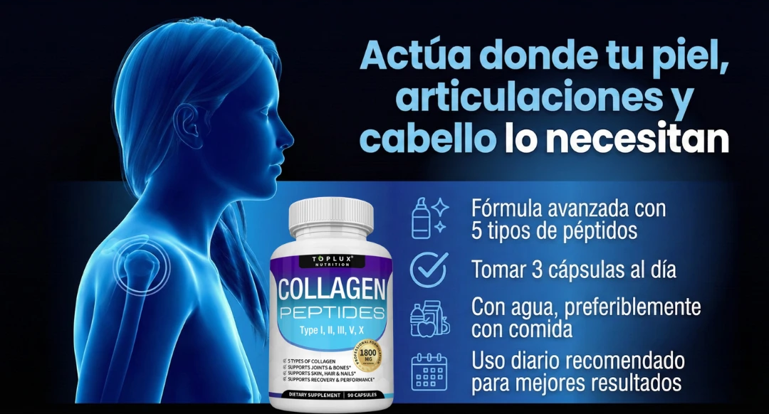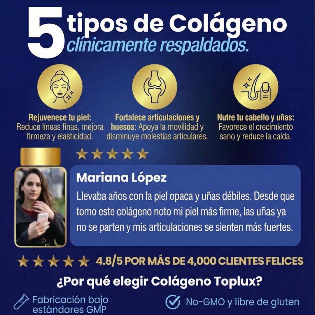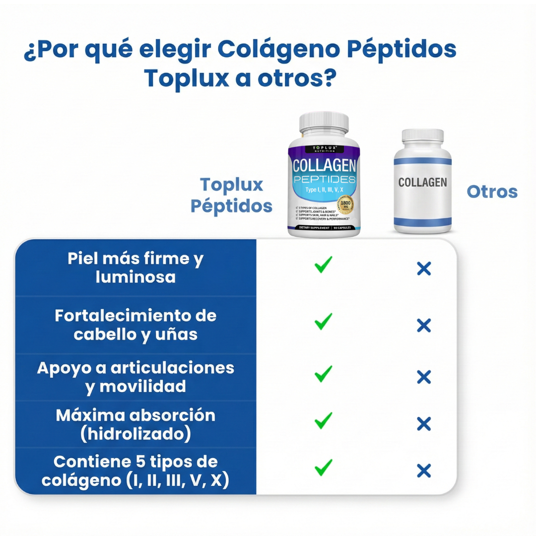 El Colágeno Péptidos Toplux contiene 5 tipos de colágeno (I, II, III, V y X), diseñados para apoyar piel, cabello, uñas, articulaciones y huesos al mismo tiempo. Además, está hidrolizado, por lo que el cuerpo lo absorbe más rápido y de manera más eficiente.