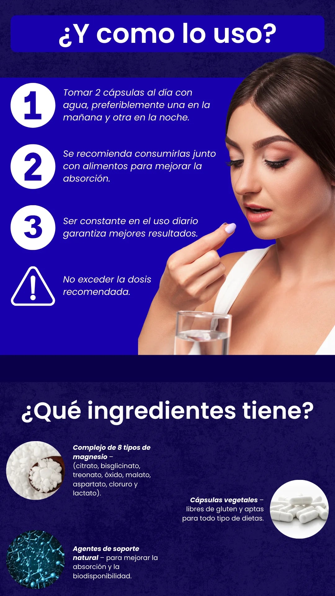 ¡Sí! Esta fórmula está diseñada para el uso diario y contiene formas equilibradas y biodisponibles de magnesio que tu cuerpo necesita. No crea hábito, es suave para el estómago y no contiene rellenos artificiales ni estimulantes fuertes. Y pueden usarlo hombres y mujeres.
